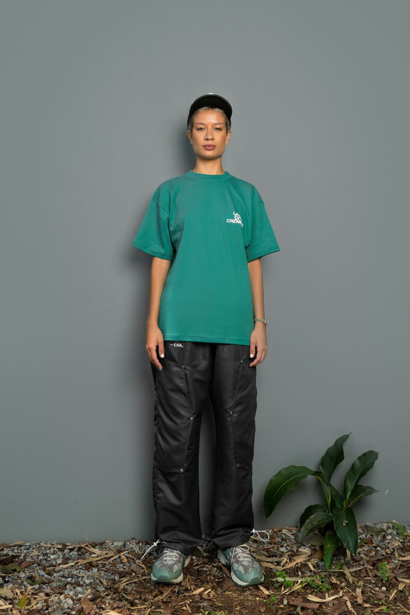 A camiseta ‘Billboard Heavy Tee’ é confeccionada em Suedine verde, um tecido nobre, de textura aveludada e toque macio, com experiência de uso confortável e caimento estruturado.