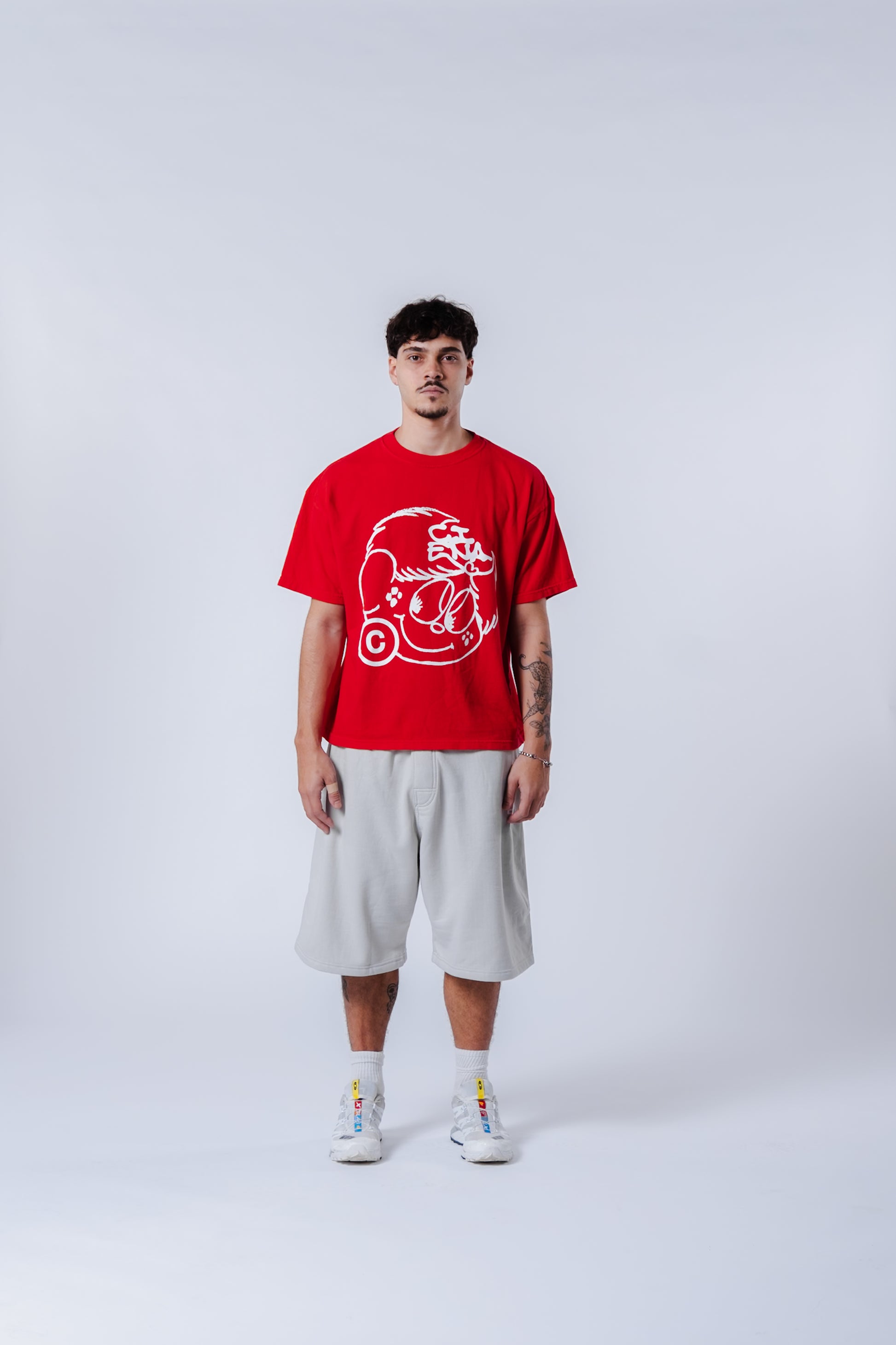 A camiseta Demo Red Tee é confeccionada em Suedine vermelho, um tecido nobre, de textura aveludada e toque macio, com experiência de uso confortável e caimento estruturado.