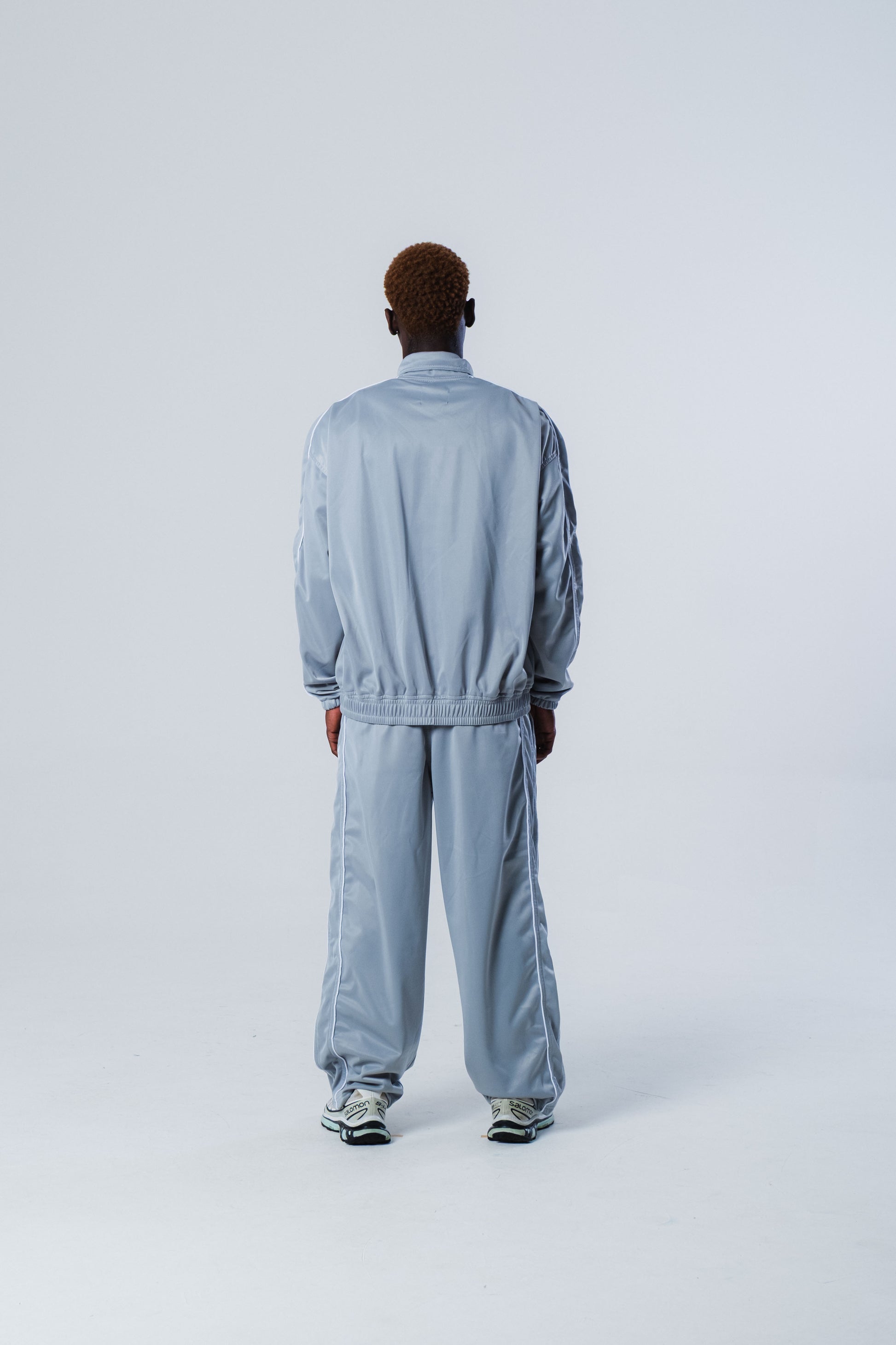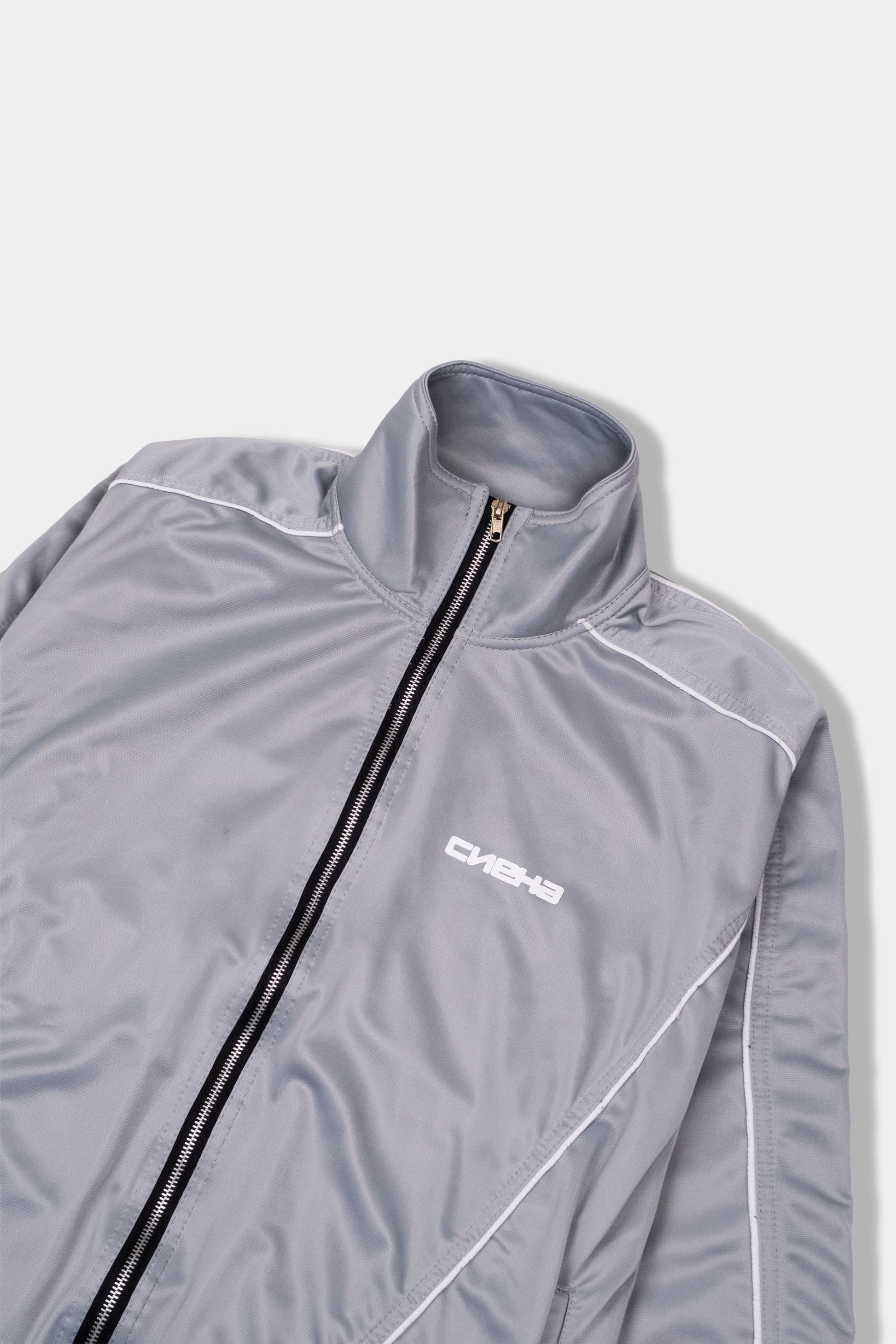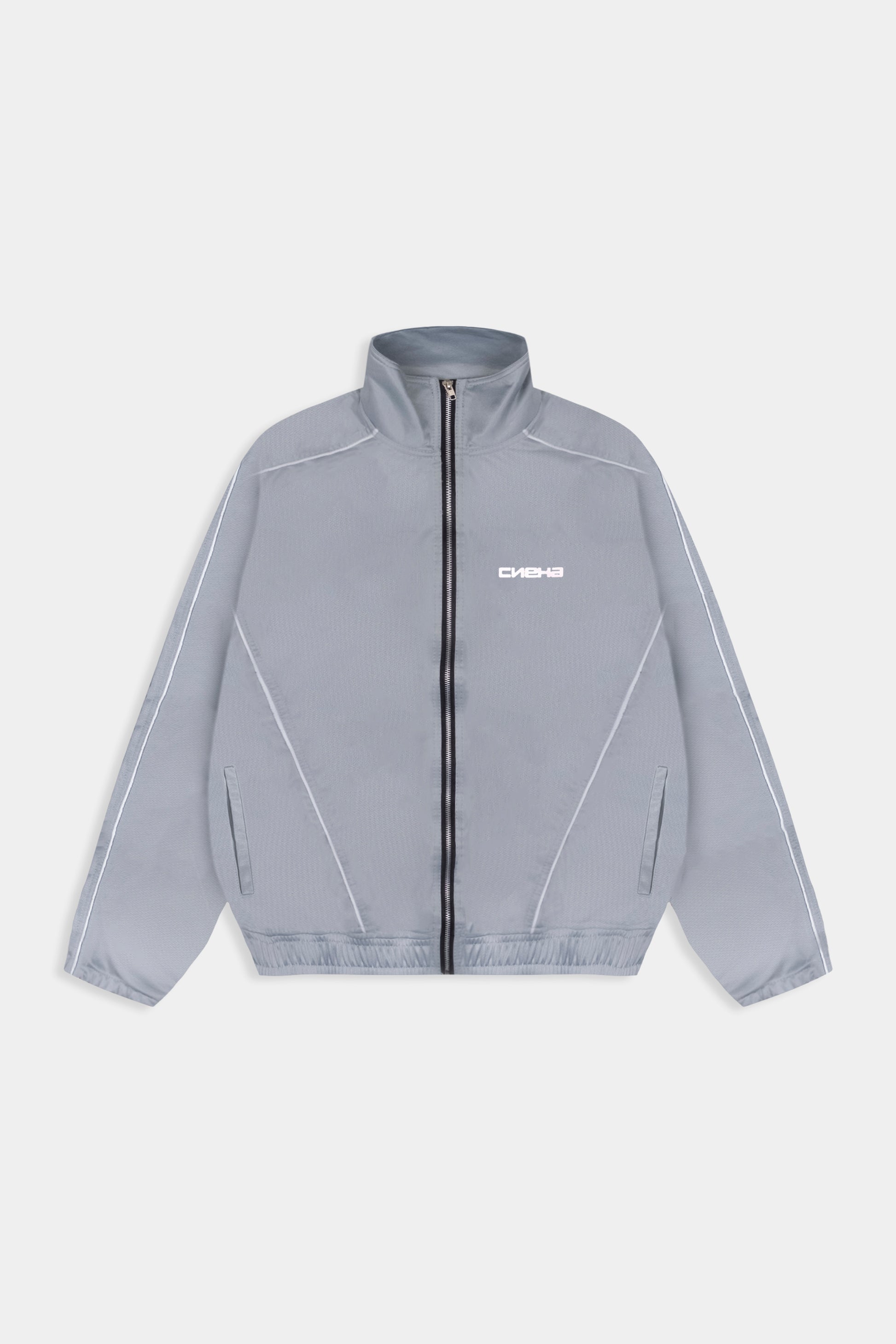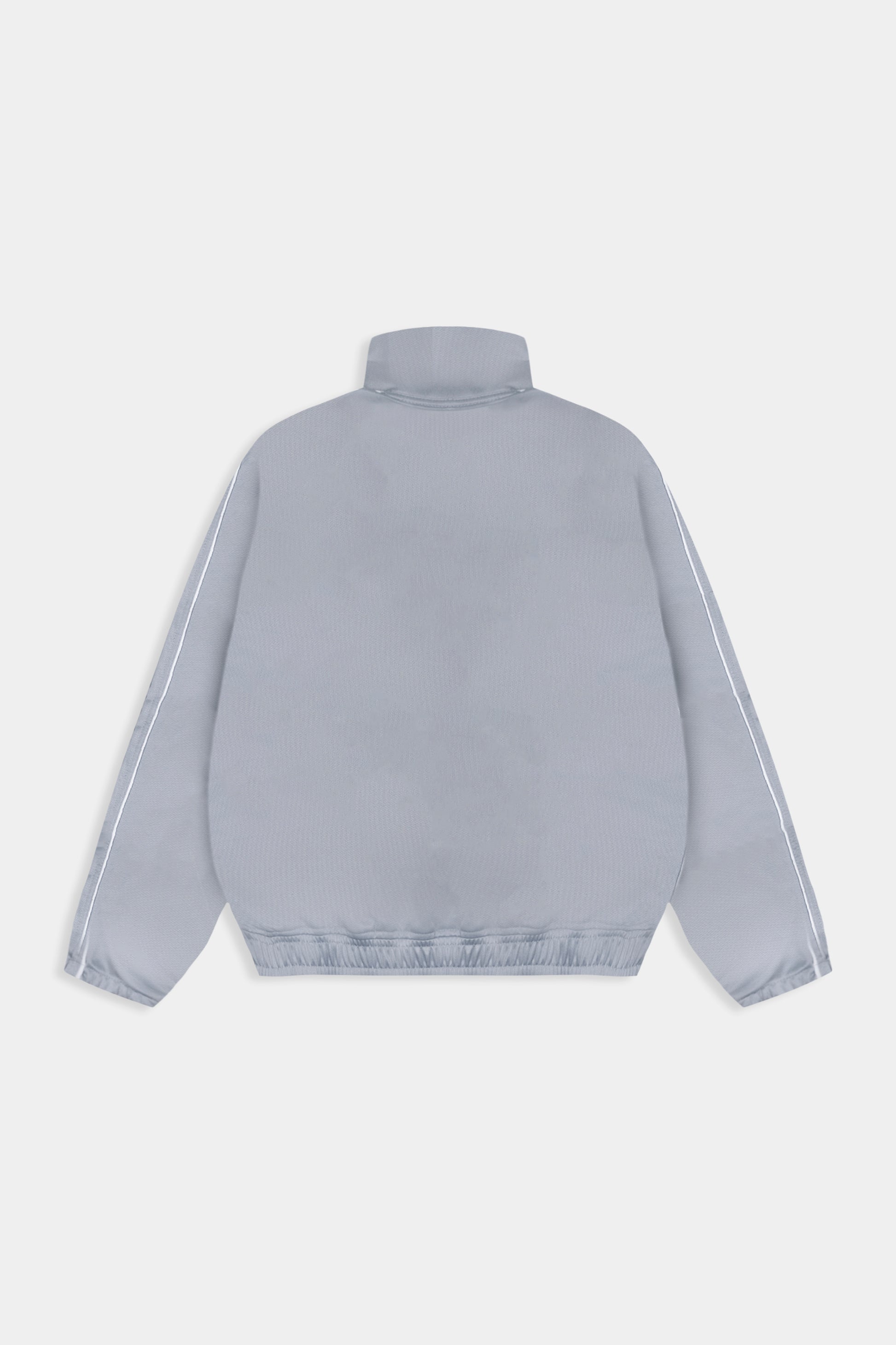 A Grey Track Jacket é confeccionada em malha chimpa, 100% poliéster, 240g, com felpa interna.