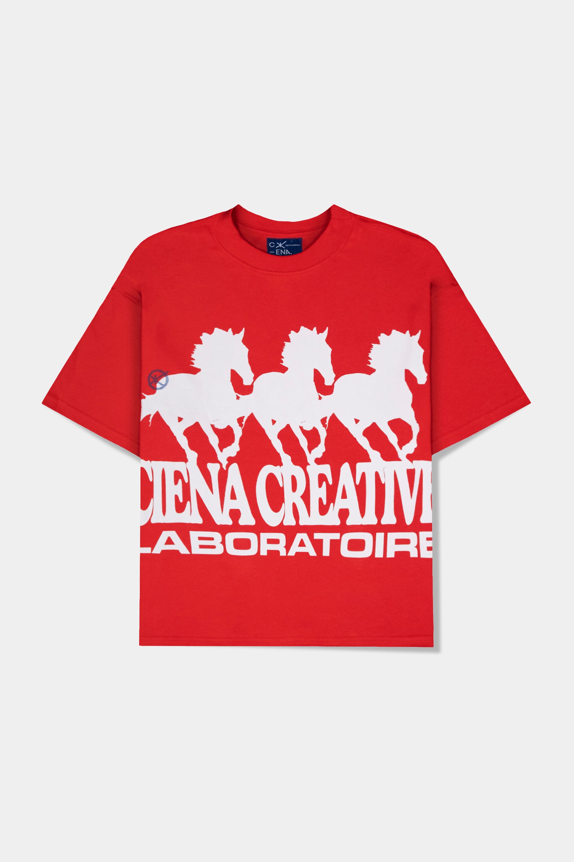 A camiseta Herd Heavy Tee é confeccionada em Suedine vermelho, um tecido nobre, de textura aveludada e toque macio, com experiência de uso confortável e caimento estruturado.