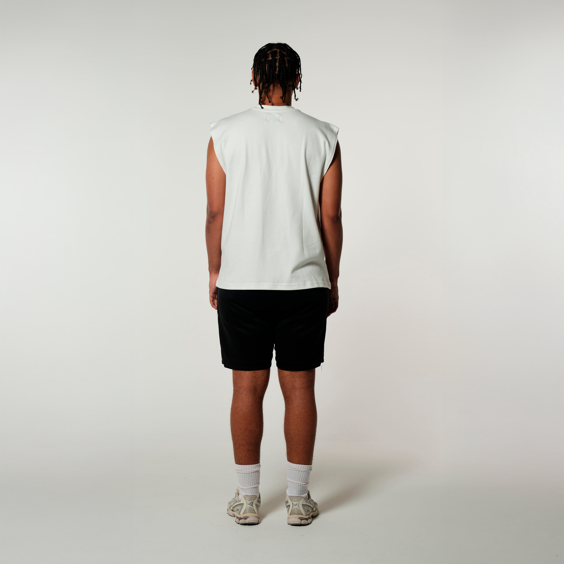 A Regata ‘Money Laundering Heavy Tanktop’ é confeccionada em Suedine off-white, um tecido nobre, de textura aveludada e toque macio, com experiência de uso confortável e caimento estruturado.