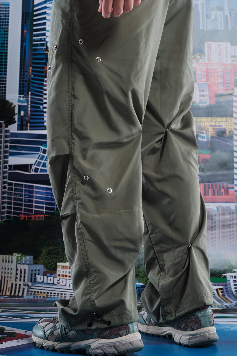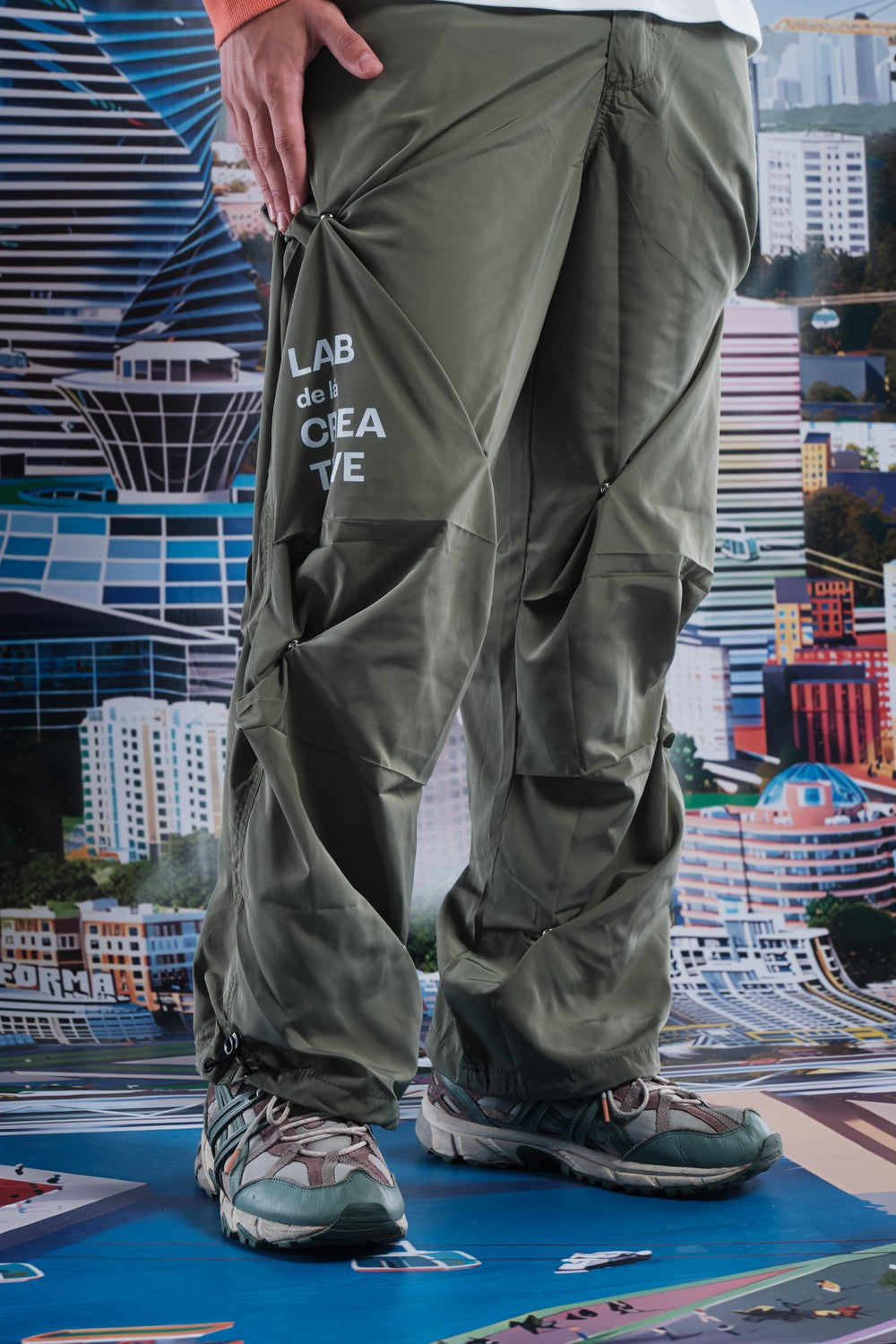 A Calça Parachute Trousers é confeccionada em material 100% poliéster, com 135 GSM na cor verde militar.