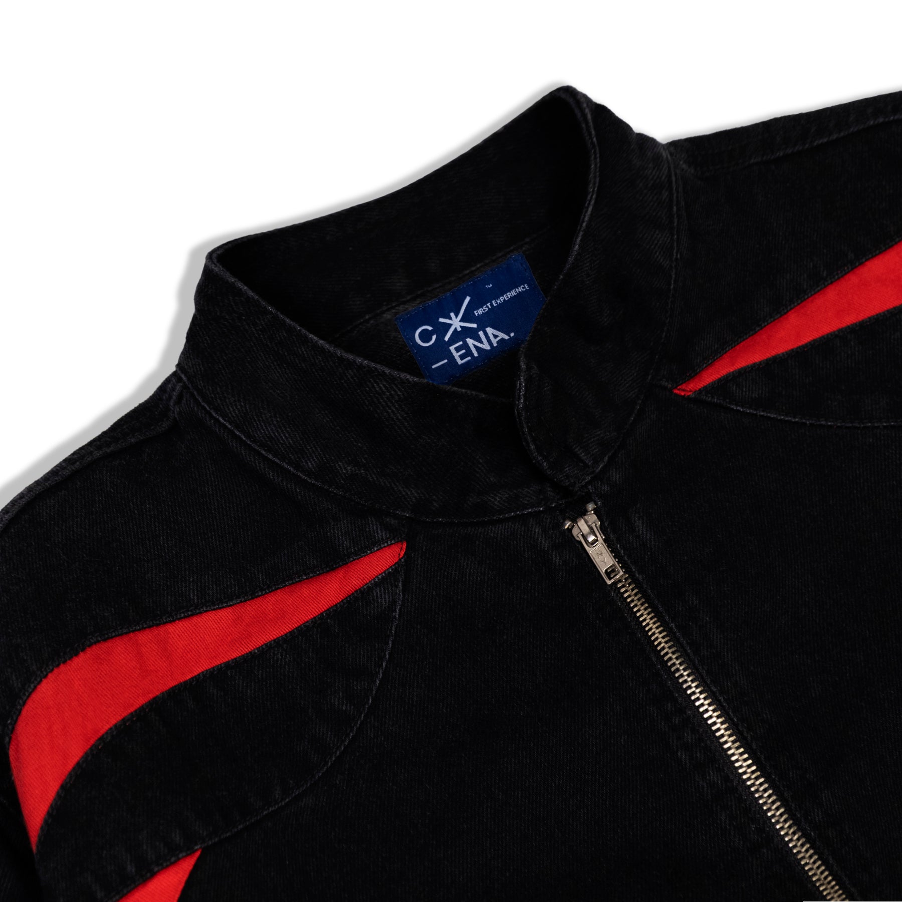 A peça possui Modelagem Boxy, lavagem especial, recortes em vermelho, dois bolsos frontais, zíper prateado com acabamento limpo e bordado localizado na lateral do ombro.