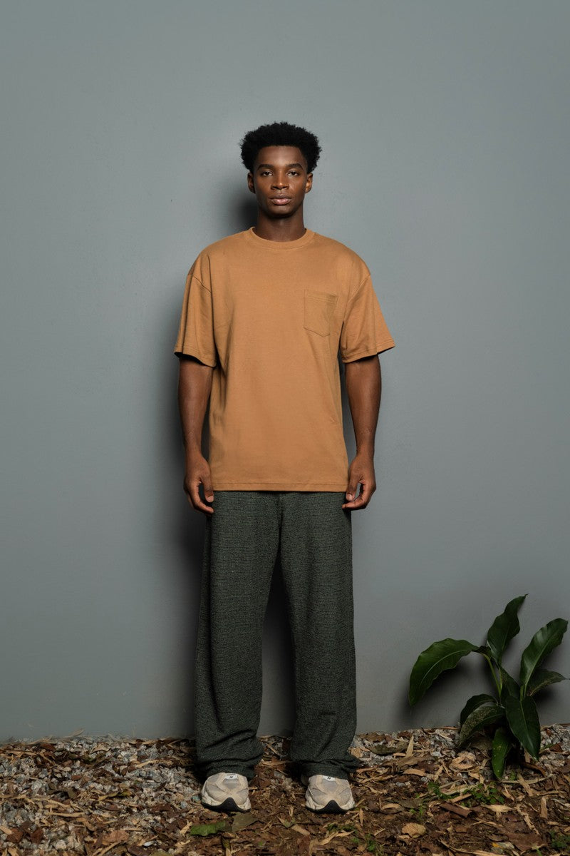 A camiseta ‘Vacancy Heavy Tee’ é confeccionada em Suedine marrom, um tecido nobre, de textura aveludada e toque macio, com experiência de uso confortável e caimento estruturado.